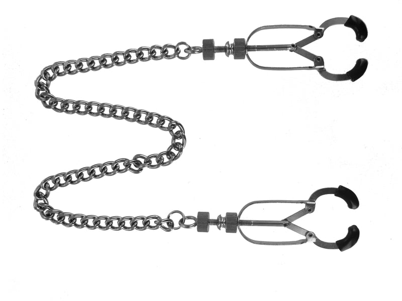 Designed for precision and strength, the Bauhaus Nipple Vice comes to you with two clamps that can be adjusted to your desired level of tightness with the adjusting screws located at the base. The tips are covered in soft TPR with the addition of a delicate curve at the very end that assists in gripping the skin of your subject. Ending this commanding piece is the addition of a 12 inch connecting chain that looks oh so enticing as it hangs from the captive nipples of your plaything. Each clamp measures 3 inches in length and opens to 0.5 inches wide.
