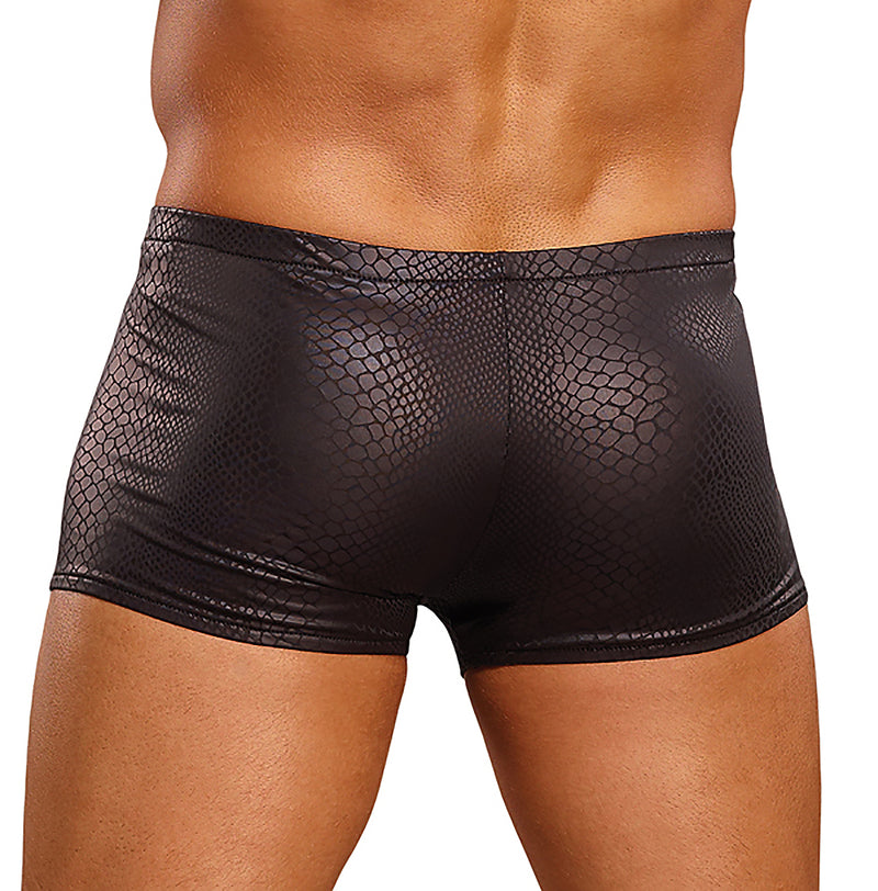 Stretch snake print mini short features comfort fit pouch and classic cut.