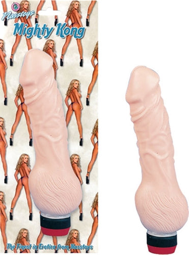 Fat vibrating jumbo head and veined flesh colored shaft. Round textured balls at base