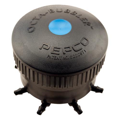 Octa-Bubbler® is a pressure compensating device with a 1/2 inch FPT inlet and 8 swivel port 3/16 inch outlets. Constructed using ABS plastic. Built in back flow prevention engineered for added protection. Octa-Bubblers deliver water to multiple locations. Optional port plugs are available for unused ports. Each Octa-Bubbler® has a 150 mesh filter screen for clog resistance. Interchangeable color coded flow control gives you the ability to change your GPH without changing the bubbler. Available flow rates are 2 GPH, 6 GPH and 10 GPH, 20 GPH using a flow control device. Pressure compensation range is 20 – 60 psi.